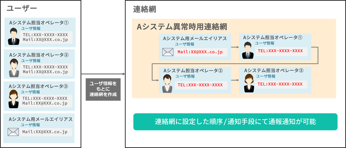 コマンドまたはREST APIを使用して通知を実行します。実行時に連絡網を指定することで、連絡網にあらかじめ設定されているユーザへ、設定された通知方法で情報が通知されます。以下にREST APIでの実行例を紹介します。この内容をスクリプト化して、JP1/IM3や他社監視製品から実行します。