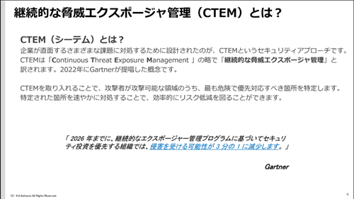 継続的な脅威エクスポージャ管理(CTEM)とは、企業が直面するさまざまな課題に対処するために設計されたセキュリティアプローチです。
