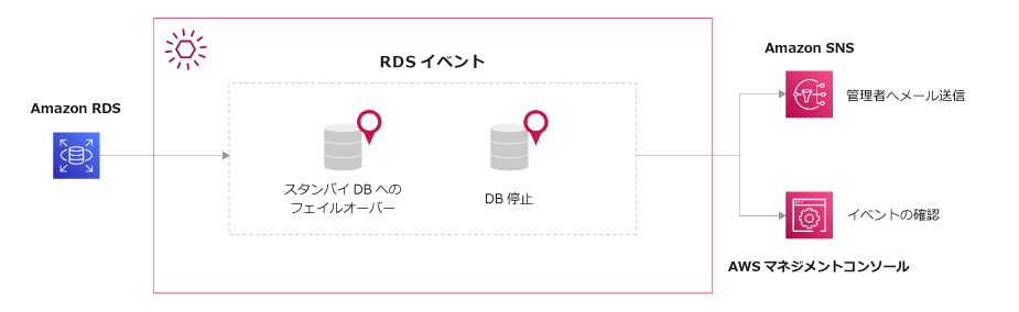 RDSイベントは、データベースの停止、マルチAZ構成におけるフェイルオーバー、自動バックアップの開始/完了などの情報が取得でき、RDSマネジメントコンソールから確認が可能です。該当イベントが発生した場合のメール通知も実装できます。