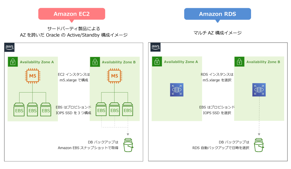 Amazon EC2では、EC2インスタンスを作成後、利用者がOracle Databaseを構築します。自由度が高い分、データベースで重要となるパフォーマンス、可用性、データ保全などをAWSのインフラストラクチャに適合しながら検討/実装する必要があります。