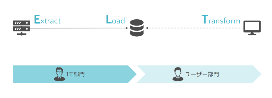 ・データを抽出し(Extract)、データウェアハウスにデータロードをしてから(Load)、