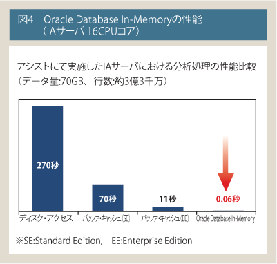 図4 のグラフは、Oracle Database In-Memoryを使用した場合に分析処理の性能がどの程度向上するのかを検証した結果です。従来のOracle Databaseでディスク・アクセスが発生した場合より4,500倍、ロー型のメモリ領域であるバッファ・キャッシュを使用した場合より100~1,000倍も性能が向上しています。1秒あたりに換算すると、約50億行のデータを処理できることになります。