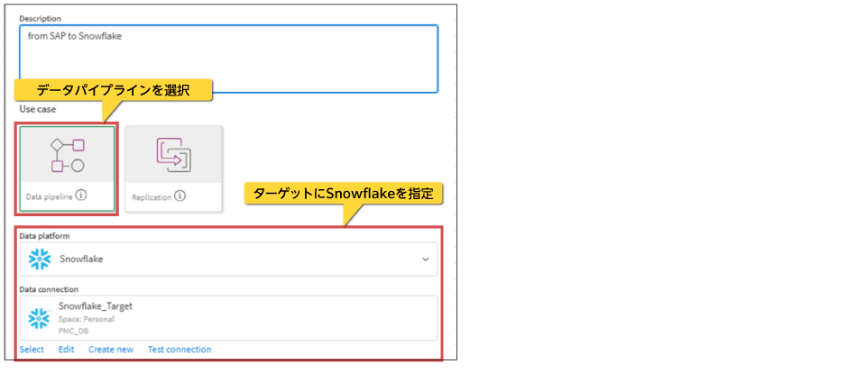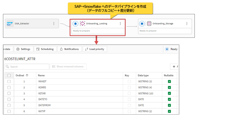 ・指定したSAP上のデータからSnowflakeへのデータパイプラインを定義します