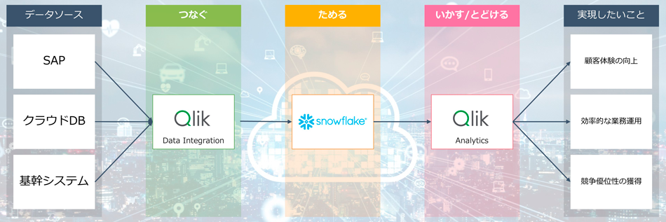 当コラムでは、SAPデータ活用基盤として、Qlik CloudとSnowflakeを利用した構成を例に、「つなぐ~ためる~いかす」の領域でSAPデータの統合や活用を考えてみます。