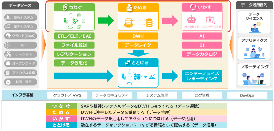 DWHやその他のデータを対象に幅広いデータ活用ニーズに対応(BI+AI)