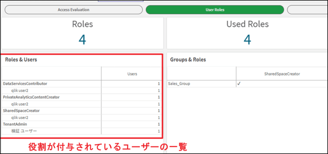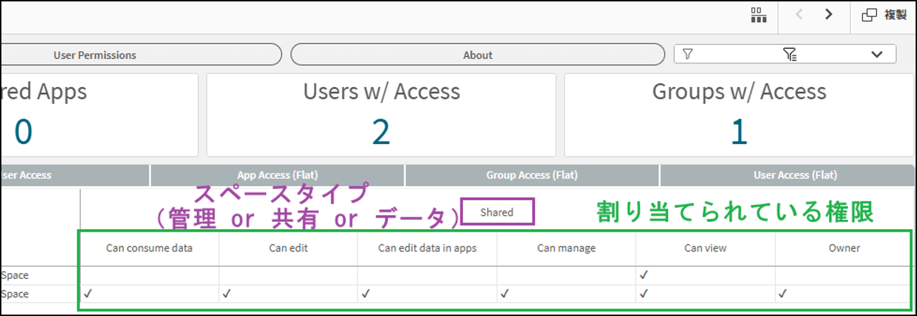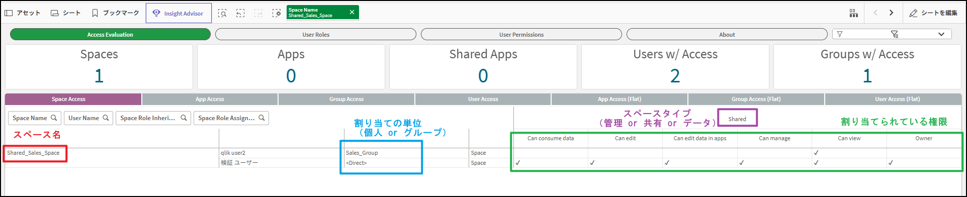 のように「Shared_Sales_Space」というスペースに対して「検証 ユーザー」と「qlik user2」にどのような権限が割り当てられているか確認できます。