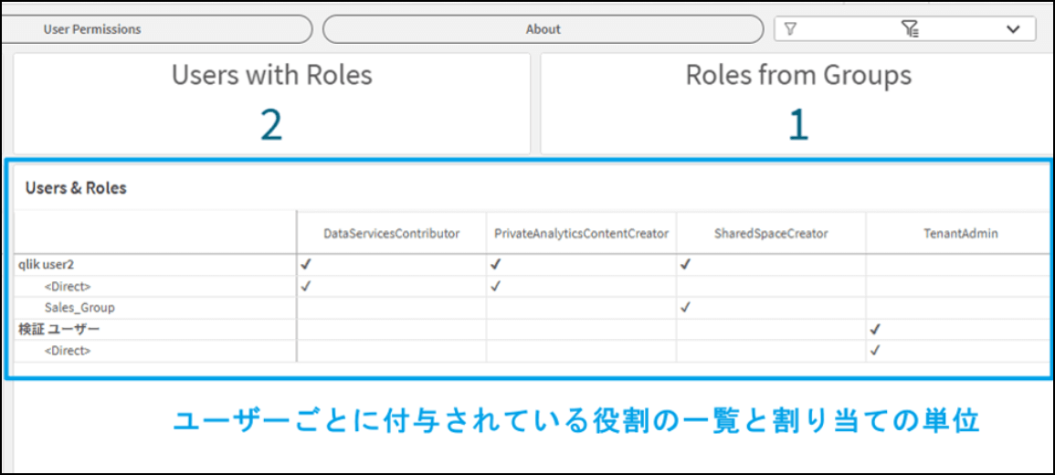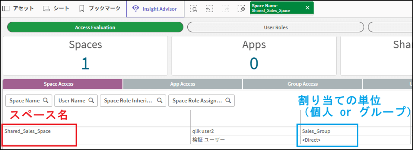 部分のように割り当て単位(Space Role Inherited From Group)が<Direct>である「検証 ユーザー」は、ユーザー個人で権限を割り当てられています。「qlik user2」は、「Sales_Group」というグループ経由で割り当てられています。