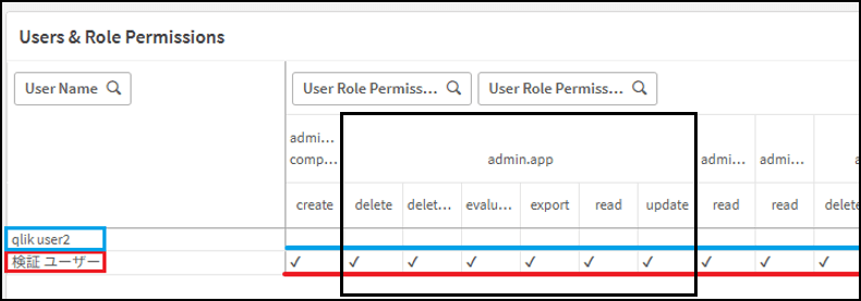 「qlik user2」には、「Can View(閲覧可能)」のみ割り当てられており、「検証 ユーザー」には、すべての権限が割り当てられています。