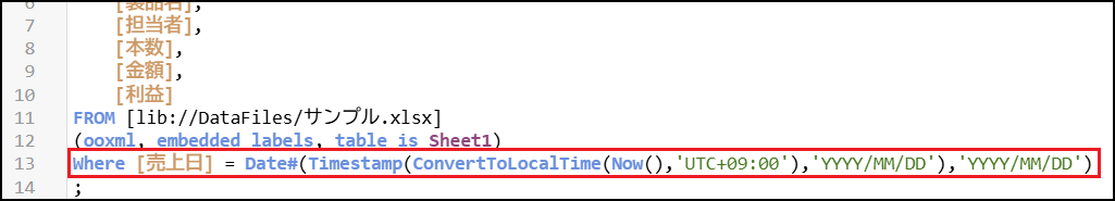 Where [売上日] = Date#(Timestamp(ConvertToLocalTime(Now(),'UTC+09:00'),'YYYY/MM/DD'),'YYYY/MM/DD')
