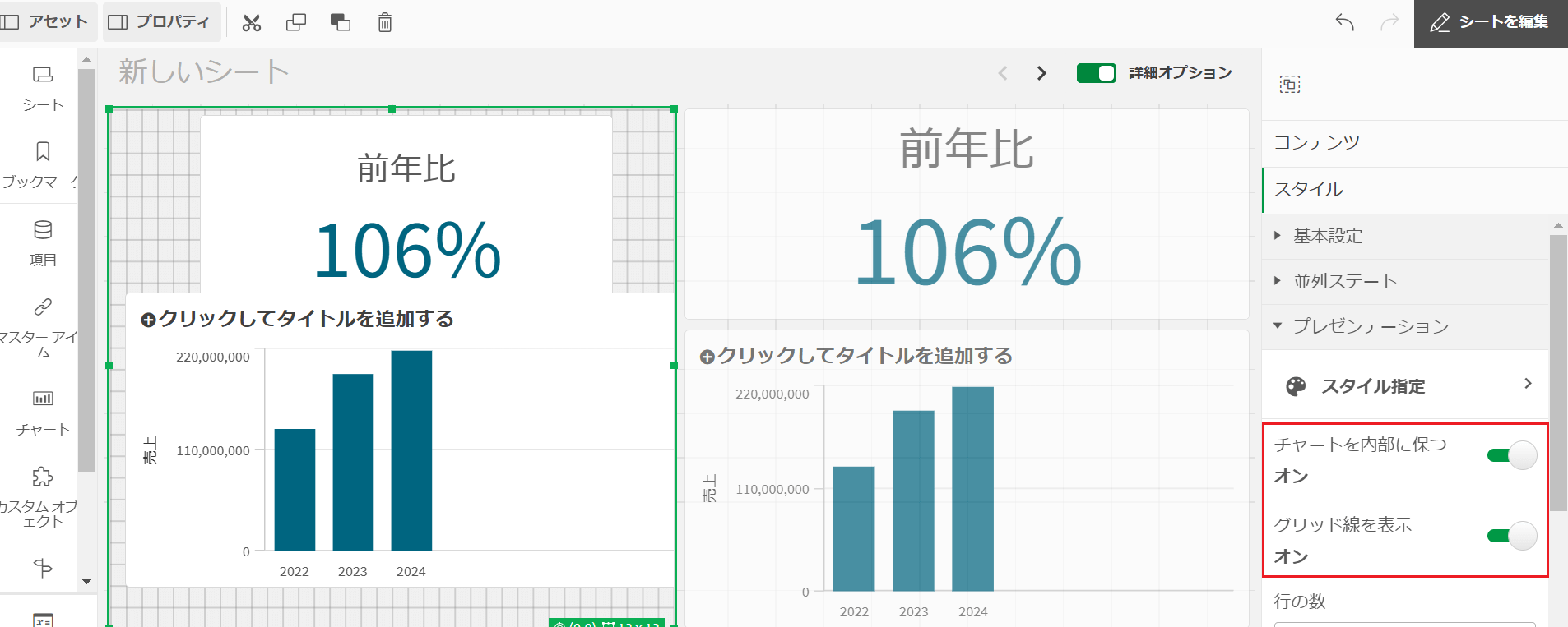 画像の左側は、グリッド線を気にせずチャートを配置、さらにチャート同士を重ねることが可能となっています。