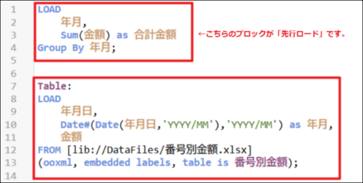 「年月日」を「年月」として取り込むためにDate#関数等を使用しますが、Group By句は項目名以外を指定できないため、先行ロードを使わない場合、以下のように、一時的に tempテーブルを作成するためNoConcatenateやDrop Tableを記述する必要があります。