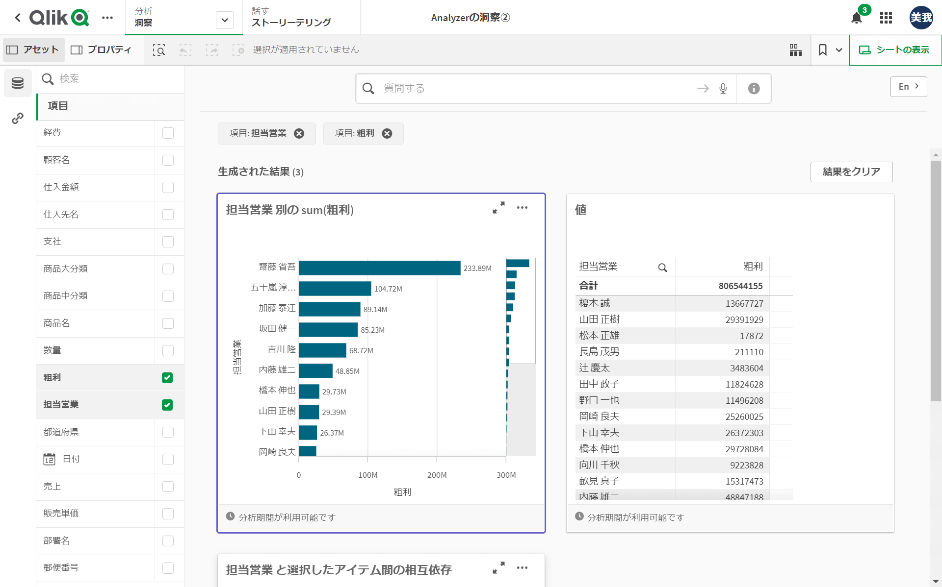 ビジネスロジックを設定していない場合と設定した場合で、参照権限の[Analyzer]ユーザーの「洞察」画面がどのように変化するのかを見てみましょう。