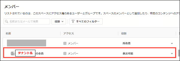 5)全社公開用のスペースには全ユーザーを追加するため、「<テナント名>の全員」の横にあるドロップダウンリストをクリックします。