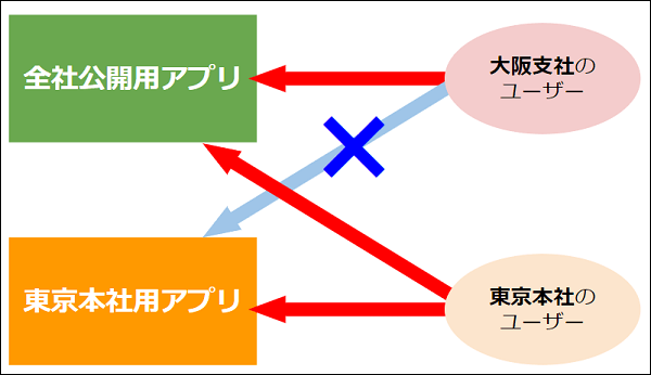 以下のように、全社公開用のアプリにはどの拠点のユーザーでも閲覧できるようにし、東京本社用のアプリは東京本社のユーザーのみが閲覧できるように設定します。