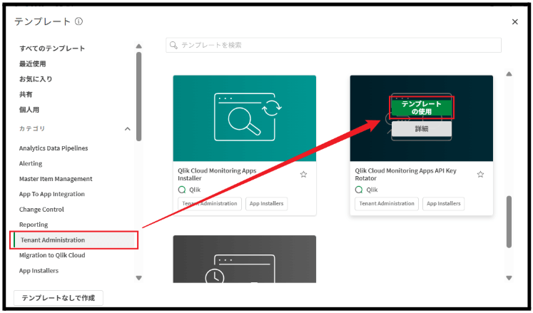 3)[Tenant Administration]>[Qlik Cloud Monitoring Apps API Key Rotator]の[テンプレートの使用]を
