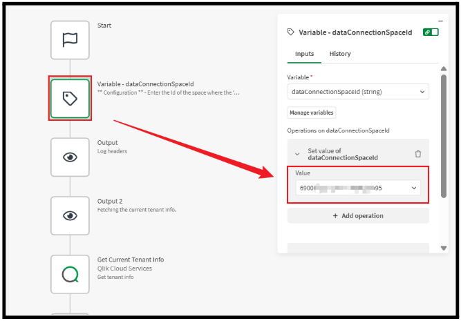 [Operations on dataConnectionSpaceId]>[Value]にスペースIDを設定します。