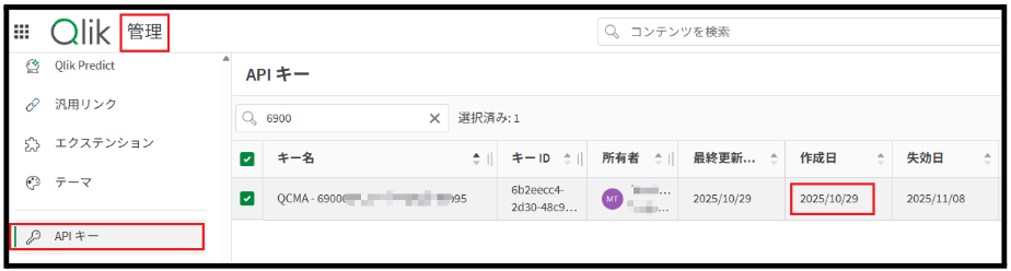 ※APIキーの最大有効期限は、Qlik Cloudの[管理]画面>[設定]>[機能コントロール]>[API キー]