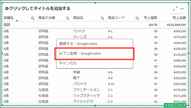 その場合、シート上に配置されている[テーブル]の上に[Straight table]をドロップし、[以下に置換:Straight table]を選択します。