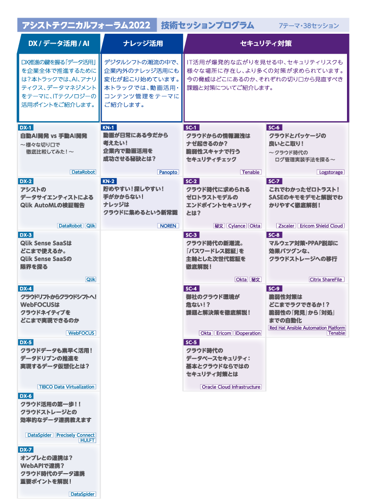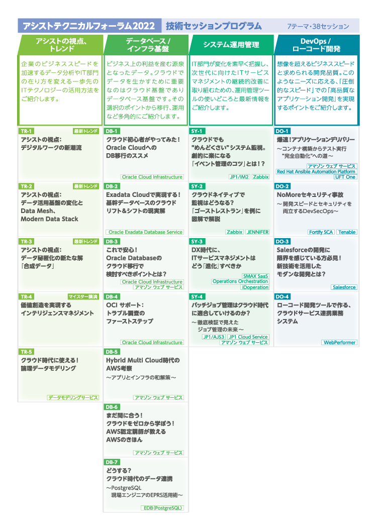 38の技術セッションをITの7つのテーマ、 「アシストの視点、トレンド」 「データベース / インフラ基盤」 「システム運用管理」 「DevOps / ローコード開発」 「DX / データ活用 / AI」 「ナレッジ活用」 「セキュリティ対策」 に分け、最新の技術情報をお届けしました。