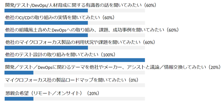 「他社の取り組み」への関心が非常に高く、特に「テスト設計」については、全参加者様が関心をお持ちでした。今後のユーザー会企画、運営に反映させていただきます。