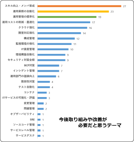 今後取り組みが必要と考えられているテーマとしては、今回のJP1ユーザー会のテーマでもある「スキル向上・メンバー育成」が最も関心が高いという結果でした。