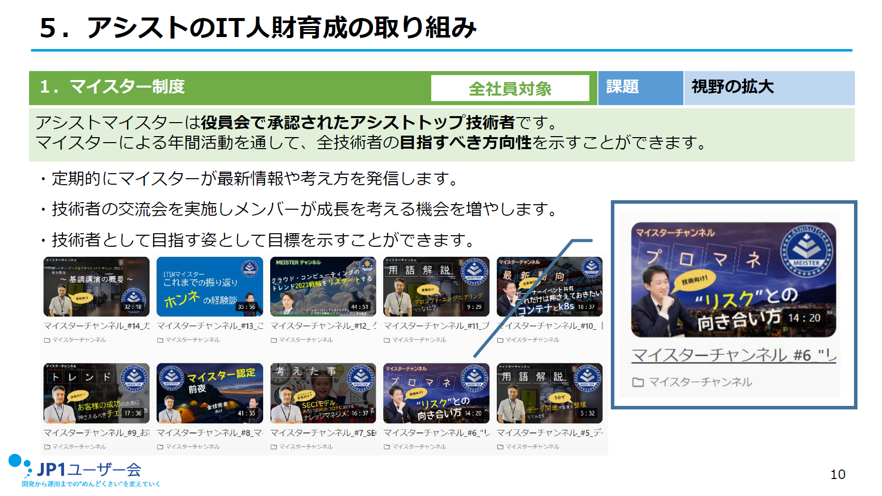 アシストのトップ技術者をマイスターとして認定することで、技術者として目指す姿を明確にすると共に、マイスターの定期的な動画発信や交流会を通じて、気づきや成長を考える機会を提供しています。