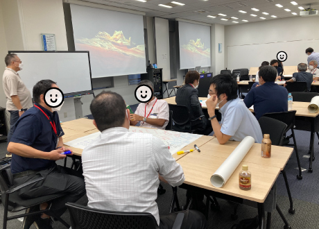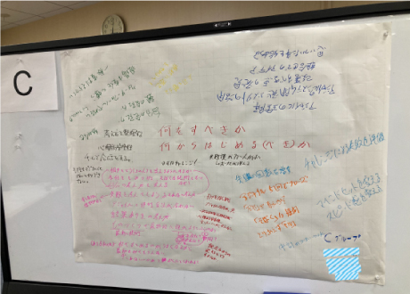 第二部では、講義での膨大なインプットを踏まえて「DXのために何をすべきか、何から始めるか」をテーマに、ワールドカフェ形式でのグループディスカッションを行いました。今回は感染症対策をしながら対面で開催しましたが、大きな模造紙に直接書き込みながらアウトプットすることで、各々の学びや意見を発散しながら、さらに他メンバーとのコミュニケーションを楽しむことができたのではないでしょうか。