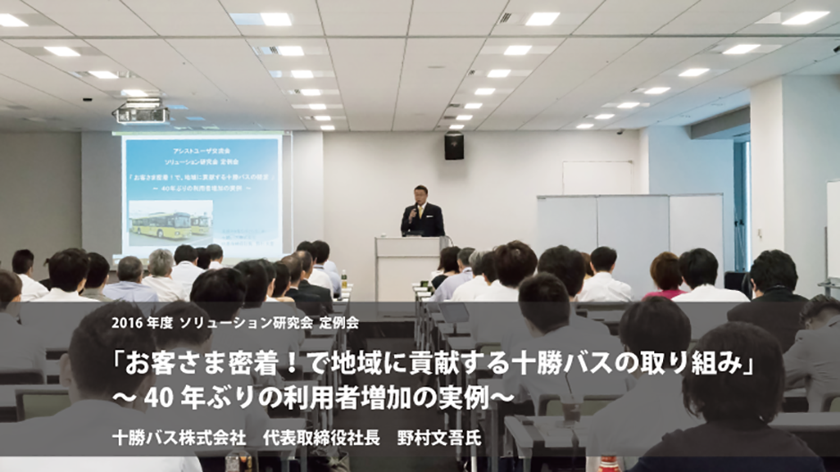 今年度の定例会の特別講演では、全国的に路線バスの経営が厳しいと言われる中、「5年連続増収」という快挙を成し遂げた十勝バス株式会社(以下、十勝バス)の代表取締役社長 野村文吾氏をお招きし、十勝バス再生の物語をご講演いただきました。前例のない地方バス会社再生の物語は多くのメディアに取り上げられて大きな反響を呼び、ミュージカルにもなったそうです。徹底した顧客ニーズの調査と営業力強化の取り組み、社員の意識改革に至る過程で見えてきた大切なことをお話しいただきました。